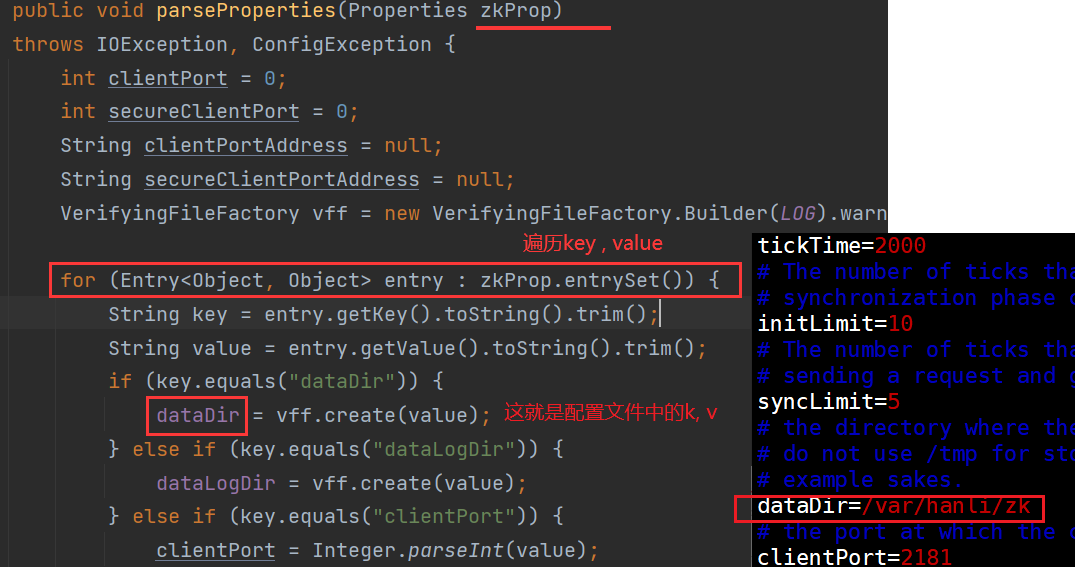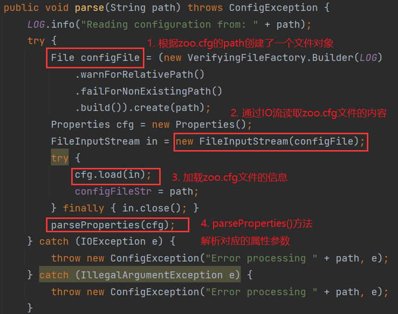 args 是我们传入的 zoo.cfg, args.length的长度为1, 所以要进入 parse() 方法开始解析?  我们再进入 parseProperties() 方法?