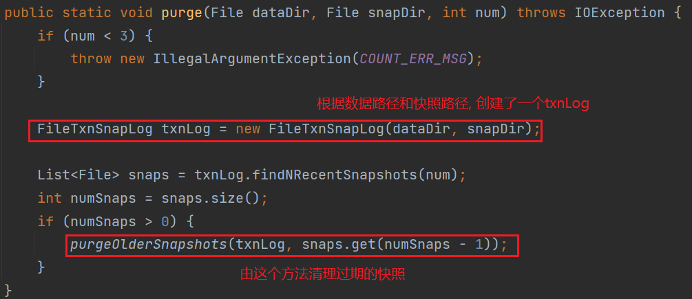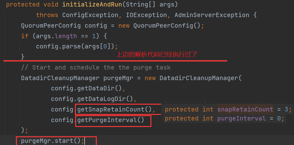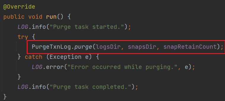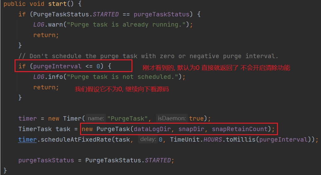 接下来我们进入 start() 方法👀  下面创建了一个 PurgeTask 对象, 那么这个 PurgeTask 对象又是什么呢? 我们进入 PurgeTask 类  最后我们发现, PurgeTask 原来是一个线程, 那么它被调度执行后就会进入 run() 方法, 我们继续查看 PurgeTask 的 run() 方法  再进入 purge() 方法  到此为止, 过期快照删除结束啦?, 让我们回到 initializeAndRun() 方法, 查看接下来的源码👀