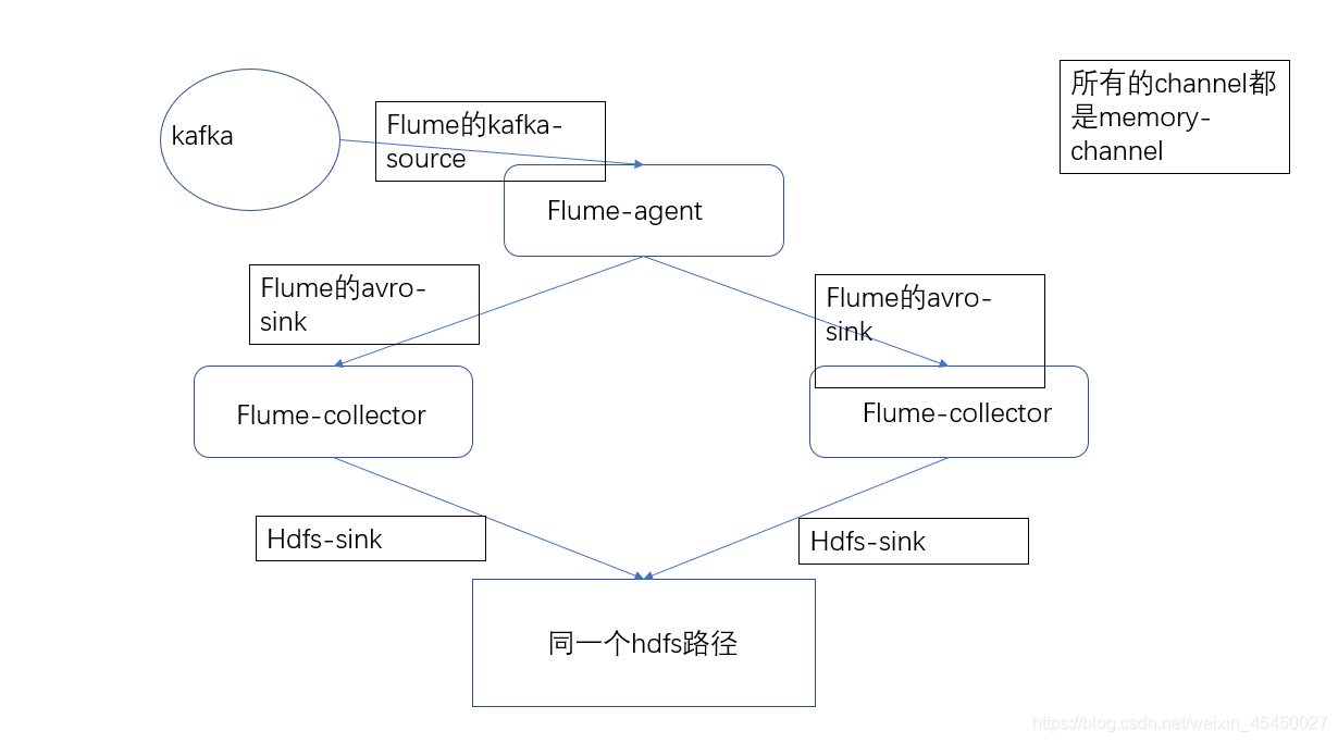 一个节点作为agent从kafka消费获取数据,然后通过avro-sink,传输到2个collector(当然同样用avro-source进行接收了),然后2个collector绑定为一个group,并配置为failover,写入hdfs-sink。