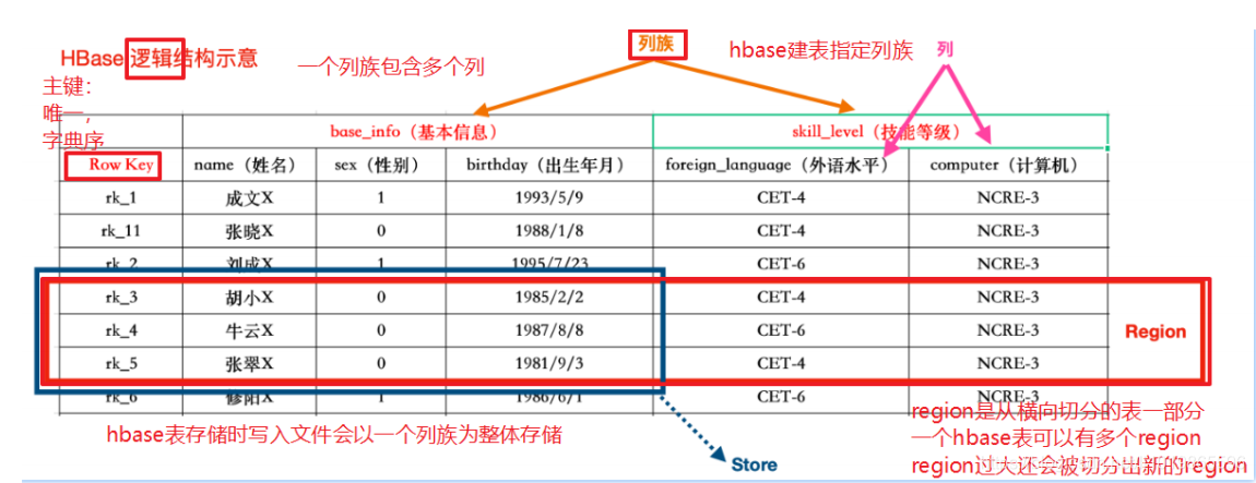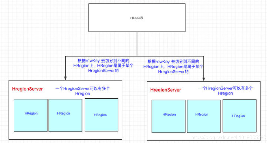 - HRegionServer是真正干活的机器(用于与hdfs交互),我们HBase表用RowKey来横向切分表