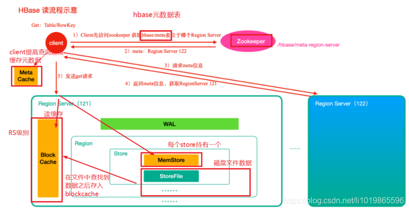 client请求到Zookeeper,然后Zookeeper返回HRegionServer地址给client,client得到Zookeeper返回的地址去请求HRegionServer,HRegionServer读写数据后返回给client。