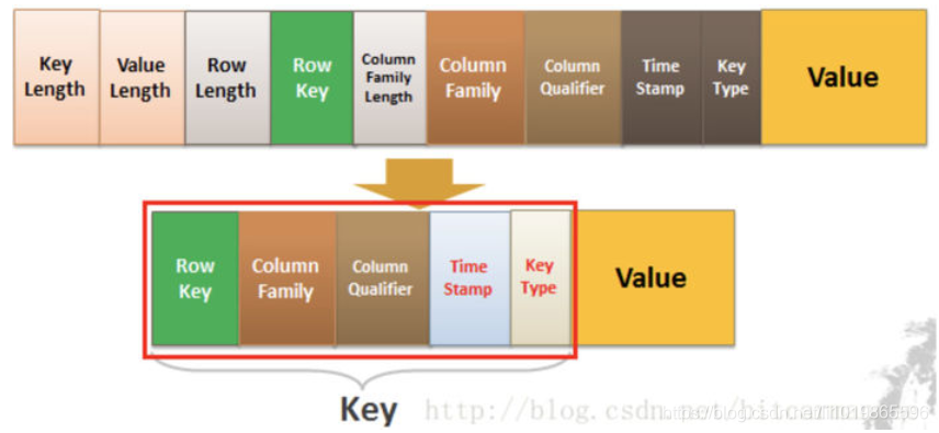 Key由RowKey(行键)+ColumnFamily(列族)+Column Qualifier(列修饰符)+TimeStamp(时间戳--版本)+KeyType(类型)组成,而Value就是实际上的值。