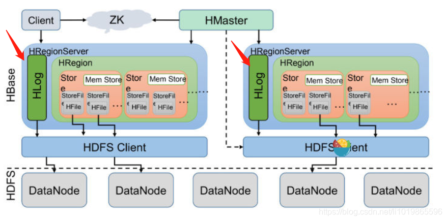 这里其实特别好理解了,我们写数据的时候是先写到内存的,为了防止机器宕机,内存的数据没刷到磁盘中就挂了。我们在写Mem store 的时候还会写一份HLog 。