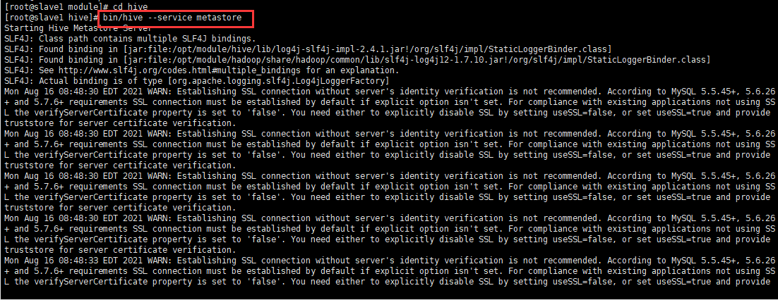 今天配置hive,启动hive server和 hive时,启动异常 异常如下:WARN: Establishing SSL connection without server’s identity verification is not recommended. According to MySQL 5.5.45+, 5.6.26+ and 5.7.6+ requirements SSL connection must be established by default if explicit option isn’t set. For compliance with existing applications not using SSL the verifyServerCertificate property is set to ‘false’. You need either to explicitly disable SSL by setting useSSL=false, or set useSSL=true and provide truststore for server certificate verification.