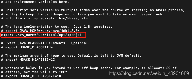 编辑HBase的环境配置文件,找到JAVA_HOME,如下: