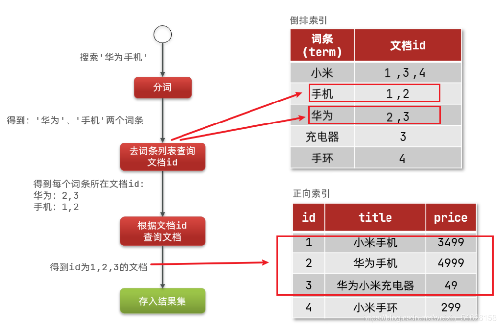 倒排索引的搜索流程如下(以搜索"华为手机"为例):