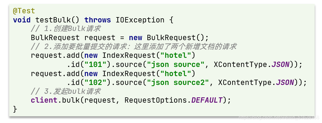 批量处理BulkRequest,其本质就是将多个普通的CRUD请求组合在一起发送。