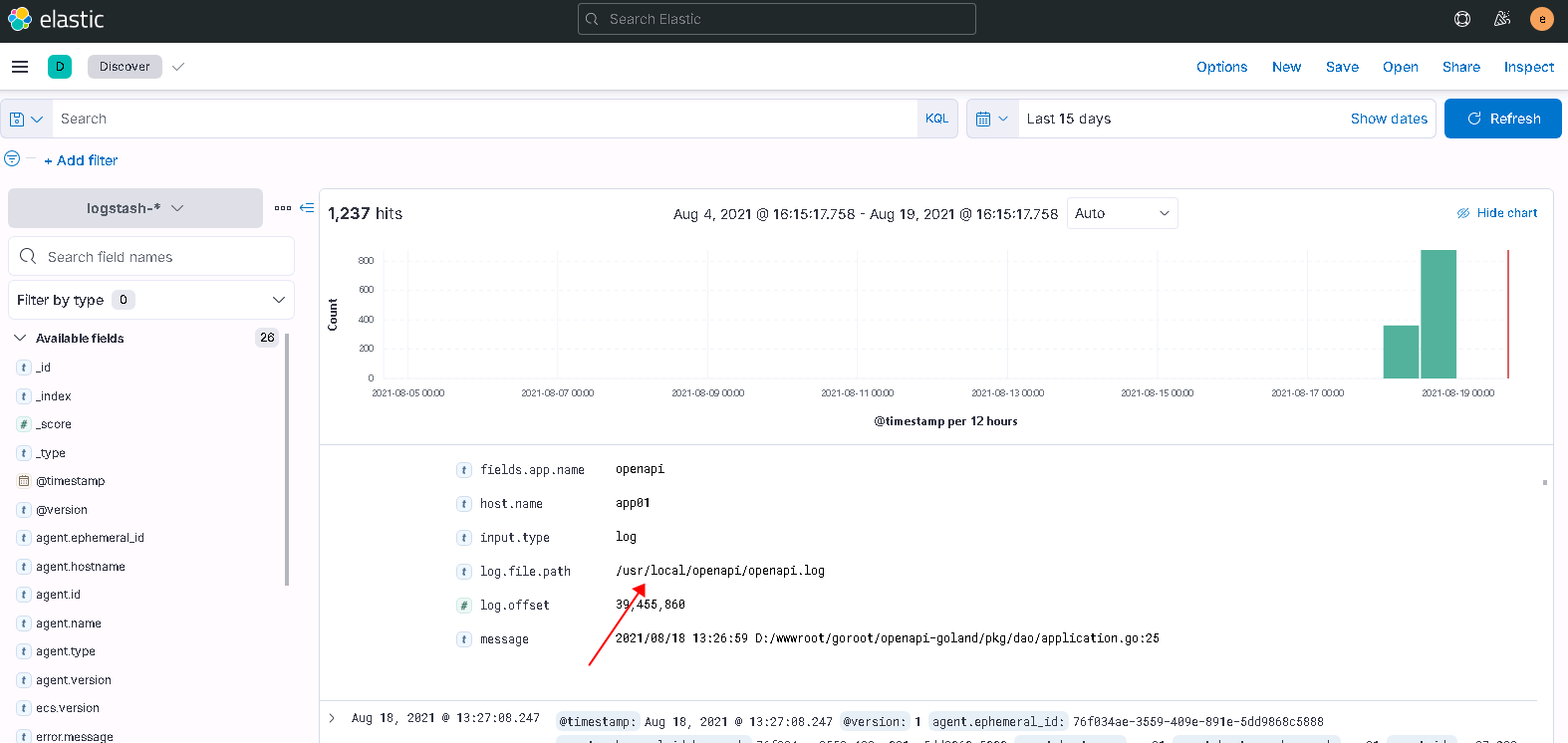 在kibana中查看filebeat采集的日志文件已经成功的上传到elasticsearch中了