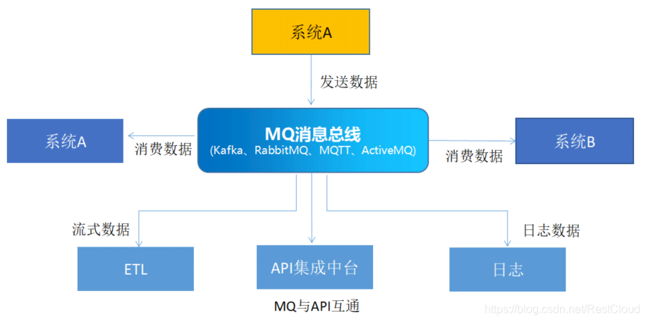 二、RestCloud MQ消息集成平台产品特点 1、MQ与API的互通 MQ消息集成平台作为RestCloud集成中台的核心产品之一是打通异步MQ消息与API的桥梁。 2、MQ消息即服务 把多种MQ消息的订阅与发布一键发布成为API,实现MQ即API服务能力。 3、消息订阅的管控 把分布在代码中的主题与队列在统一的Web消息总线中进行可视化的管控和治理。 4、多种MQ组件统一管理 集中管理企业部署的多种MQ(Kafka,RabbitMQ、RocketMQ,ActiveMQ,MQTT...)实现统一的管理和监控。
