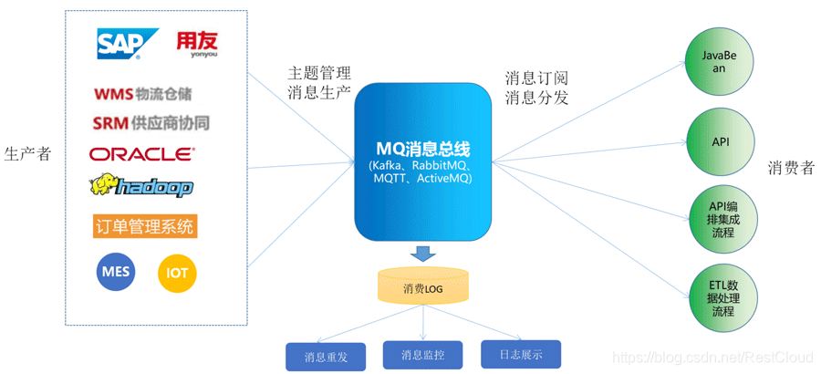 MQ消息集成平台,是RestCloudiPaaS混合集成中台核心产品之一,基于Web界面操作可以快速实现多种MQ(Kafka、RabbitMQ、RocketMQ、ActiveMQ、MQTT)消息的统一消费和管理。 一、RestCloud MQ消息集成平台介绍 1、消息订阅 基于Web界面操作可以快速实现多种MQ(Kafka、RabbitMQ、RocketMQ、ActiveMQ、MQTT)消息的统一消费和管理。 2、消息发布 通过MQ消息集成平台可以快速实现MQ消息的生产,多种MQ无需代码即可一键发布成为Restful API,通过API即可实现MQ与其他业务系统以及前端的打通。 3、统一消费、自动记录、自动重发 通过消息总线MQ可以统一消费(Kafka、RabbitMQ、RocketMQ、ActiveMQ、MQTT)中的消息并自动分发给API网关、API业务编排流程、ETL数据集成流程等等,并实现消息的自动记录和失败重发。 4、异步调用、流量削峰 通过MQ把原来同步调用的API实现异步调用,把不同生产以及消费速率不一样的API进行流量的削峰,通过MQ可增强系统集成的稳定性和可靠性。