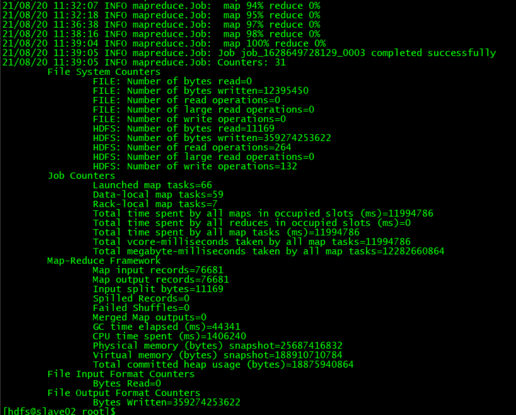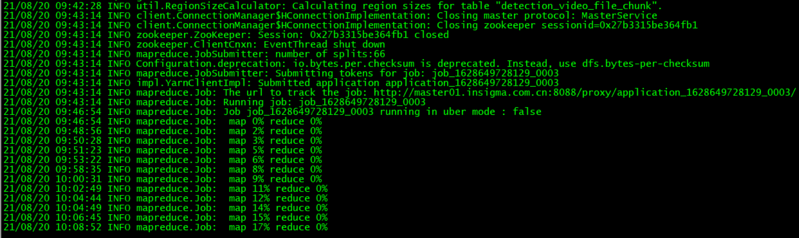 从yarn管理平台上可以看到,数据导出到HDFS中耗时1小时55分48秒(导出数据334G),我是3张表同时导出的,一次导出一张表速度应该会快很多。