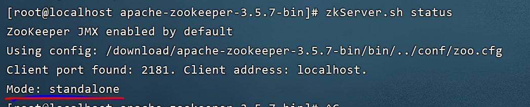 ZooKeeper JMX enabled by default Using config: /download/apache-zookeeper-3.5.7-bin/bin/…/conf/zoo.cfg Client port found: 2181. Client address: localhost. Mode: follower 这个是从