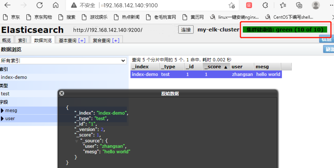 [root@node1 elasticsearch-head]# curl -XPUT 'localhost:9200/index-demo/test/1?pretty' -H 'content-Type:application/json' -d '{"user":"zhangsan","mesg":"hello world"}'