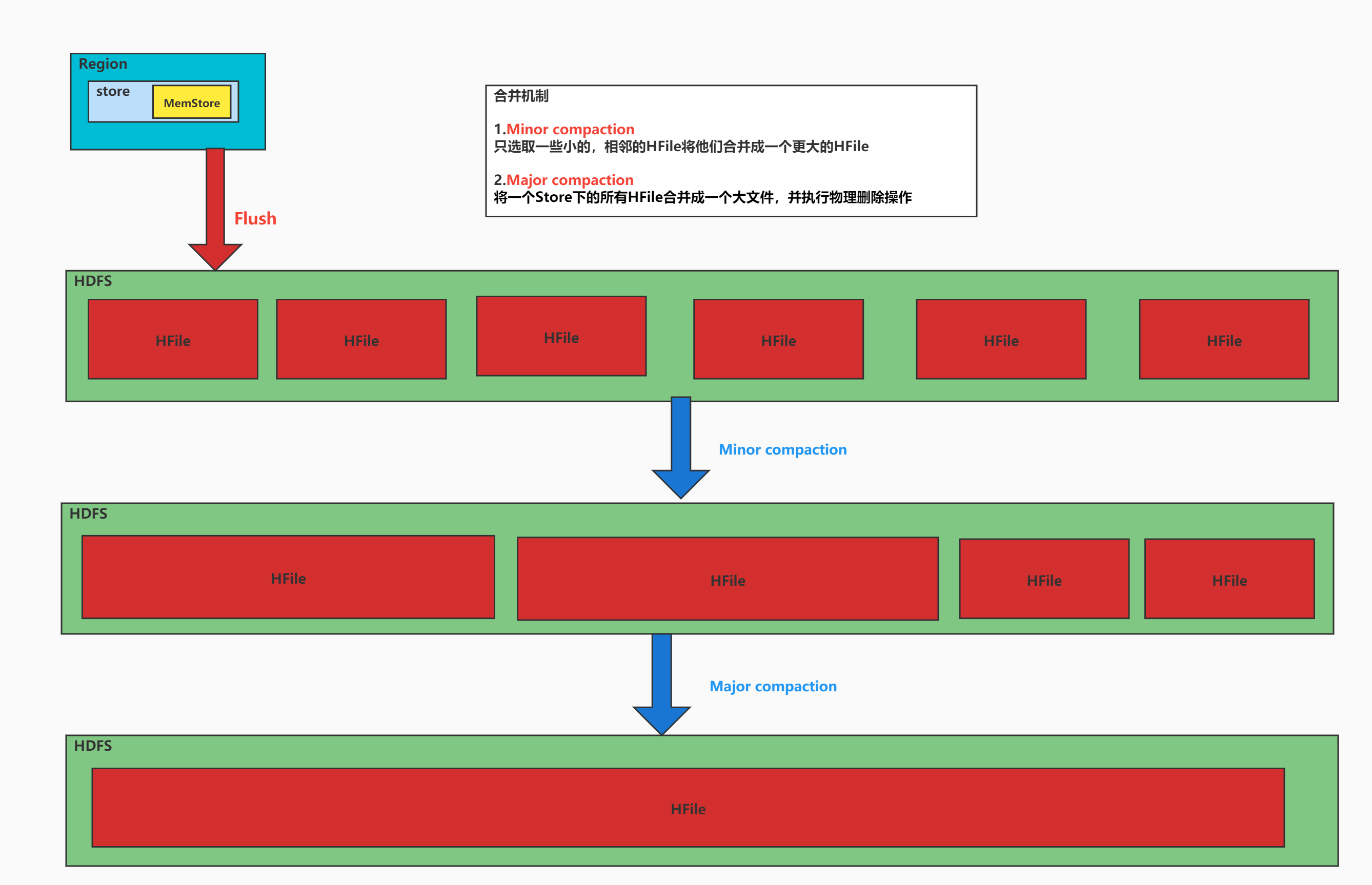 Compaction 分为两种,分别是Minor Compaction和 Major Compaction 。Minor Compaction会将临近的若干个较小的HFile合并成一个较大的HFile。但不会清理 过期和删除 的数据。Major Compaction 会将一个Store 下的所有的HFile合并成一个大HFile,并且会 清理掉过期和删除 的数据