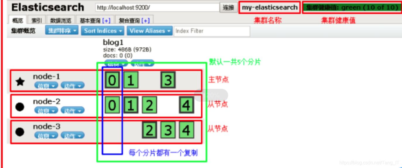 一个索引可以存储超出单个节点硬件限制的大量数据。比如,一个具有10亿文档的索引占据1TB的磁盘空间,而任一节点都没有这样大的磁盘空间;或者单个节点处理搜索请求,响应太慢。为了解决这个问题,Elasticsearch提供了将索引划分成多份的能力,这些份就叫做分片。当你创建一个索引的时候,你可以指定你想要的分片的数量。每个分片本身也是一个功能完善并且独立的“索引”,这个“索引”可以被放置到集群中的任何节点上。分片很重要,主要有两方面的原因: 1)允许你水平分割/扩展你的内容容量。 2)允许你在分片(潜在地,位于多个节点上)之上进行分布式的、并行的操作,进而提高性能/吞吐量。 至于一个分片怎样分布,它的文档怎样聚合回搜索请求,是完全由Elasticsearch管理的,对于作为用户的你来说,这些都是透明的。 在一个网络/云的环境里,失败随时都可能发生,在某个分片/节点不知怎么的就处于离线状态,或者由于任何原因消失了,这种情况下,有一个故障转移机制是非常有用并且是强烈推荐的。为此目的,Elasticsearch允许你创建分片的一份或多份拷贝,这些拷贝叫做复制分片,或者直接叫复制。 复制之所以重要,有两个主要原因: 在分片/节点失败的情况下,提供了高可用性。因为这个原因,注意到复制分片从不与原/主要(original/primary)分片置于同一节点上是非常重要的。扩展你的搜索量/吞吐量,因为搜索可以在所有的复制上并行运行。总之,每个索引可以被分成多个分片。一个索引也可以被复制0次(意思是没有复制)或多次。一旦复制了,每个索引就有了主分片(作为复制源的原来的分片)和复制分片(主分片的拷贝)之别。分片和复制的数量可以在索引创建的时候指定。在索引创建之后,你可以在任何时候动态地改变复制的数量,但是你事后不能改变分片的数量。 默认情况下,Elasticsearch中的每个索引被分片5个主分片和1个复制,这意味着,如果你的集群中至少有两个节点,你的索引将会有5个主分片和另外5个复制分片(1个完全拷贝),这样的话每个索引总共就有10个分片。