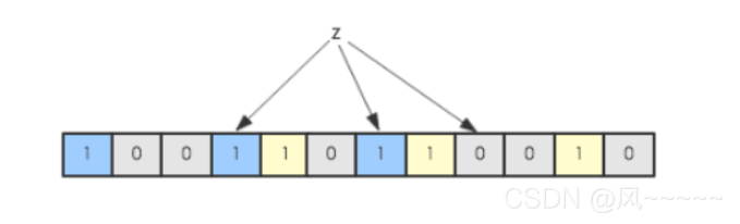 我们判断z在不在该数组中,只要看其经过相同的几次哈希算法之后,对应索引上是否为1,即可。(但有可能不在该数组的数字,经过哈希算法后,发现对应index上恰好为1,所以布隆过滤器只能保证不符合规则的元素一定不在该数组中,而符合规则的则不一定真的在该数组中。)
