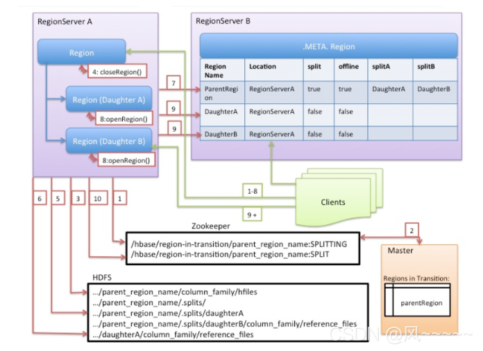 region server将zookeeper上的/HBase/region-in-transition/region-name的状态改成split。master可以感知到split的完成。之后,balancer可以将子region分配到其他region server。 -