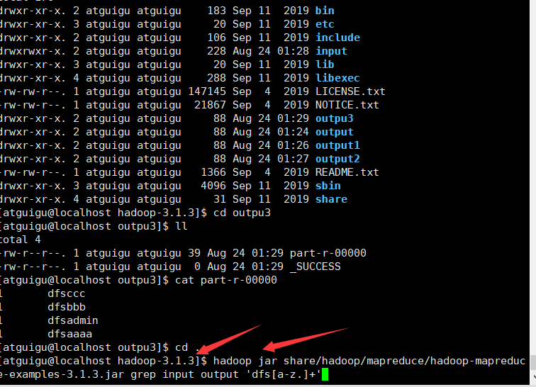[atguigu@localhost hadoop-3.1.3]$ hadoop jar share/hadoop/mapreduce/hadoop-mapreduce-examples-3.1.3.jar grep input output 'dfs[a-z.]+'