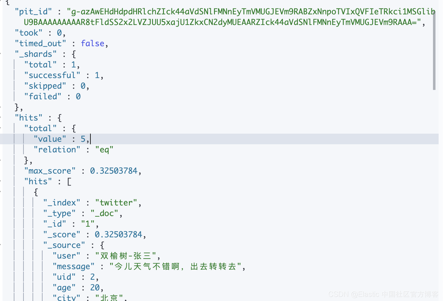 这到底是怎么回事呢?究其原因就是当我们查询时使用 pit 参数时,它只能查询在那个时间点之前的所有文档,而后面新增加的文档不能被查询到。这个在实际的很多应用中非常有用。比如针对一个快速变化的索引来说,我们想对它进行表格化,我们不希望在我们进行分页时每次得到的数据集是不同的。