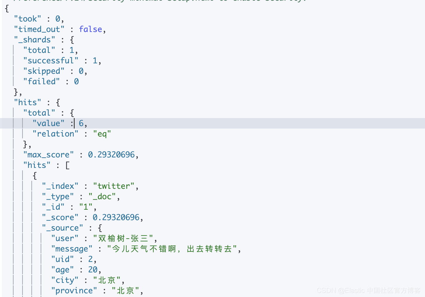 请注意这个文档的 city 字段也是 “北京”,那么在新增加一个文档后,再次来做如下的查询: