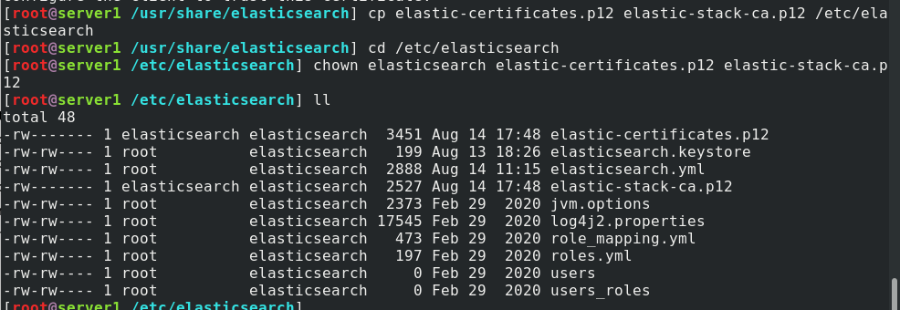 [root@server1 /etc/elasticsearch] chown elasticsearch elastic-certificates.p12 elastic-stack-ca.p12