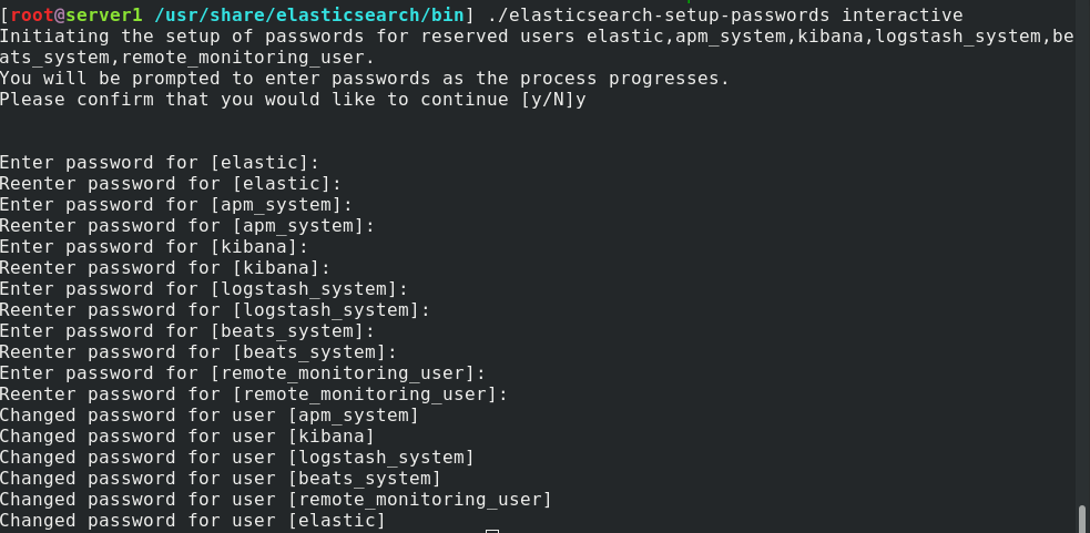 [root@server1 /usr/share/elasticsearch/bin] ./elasticsearch-setup-passwords interactive