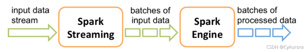 ????????接收实时输?数据流,然后将数据拆分成多个batch,?如每收集1秒的数据封装为?个batch,然后将每个batch交给Spark的计算引擎进?处理,最后会?产出?个结果数据流,其中的数据,也是由?个?个的batch所组成的。