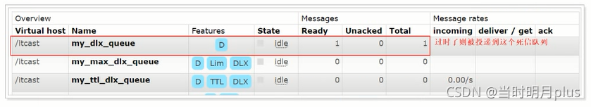 上面发送的3条消息中的第1条消息会被投递到死信队列中(如果启动了消费者,那么队列消息很快会被取走消费掉);