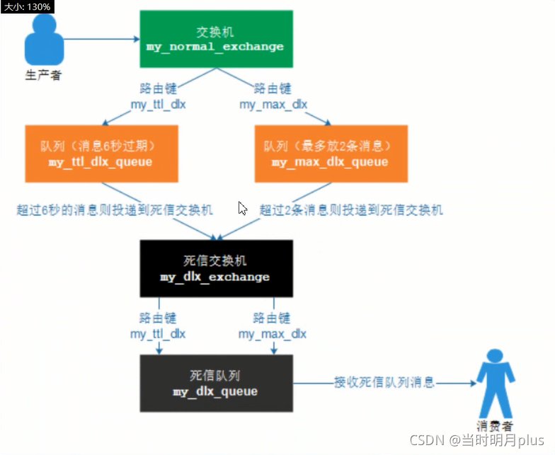 如果上述两种方法同时使用,则消息的过期时间以两者之间TTL较小的那个数值为准。消息在队列的生存时间一旦超过设置的TTL值,就称为dead message被投递到死信队列, 消费者将无法再收到该消息。