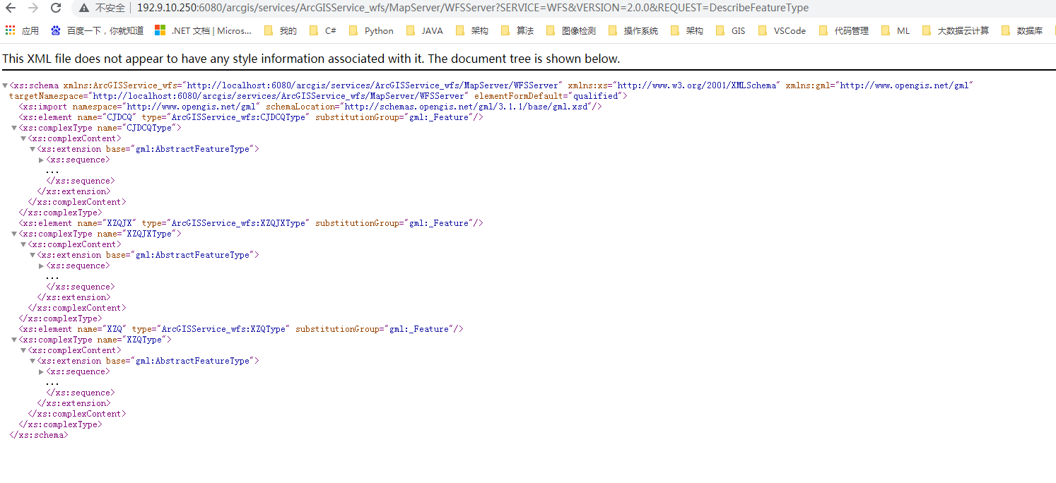 http://192.9.100.194:6080/arcgis/services/ArcGISService_wfs/MapServer/WFSServer?SERVICE=WFS&VERSION=2.0.0&REQUEST=DescribeFeatureType&TYPENAME=XZQ