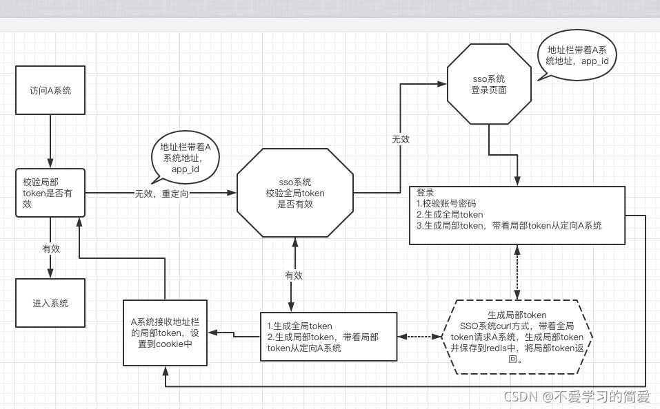 ????????????????????????1. 用户访问系统A,系统A发现用户未登录(中间件校验局部token是否有效),跳转至sso系统校验全局是否登录,并将自己的地址等作为参数。