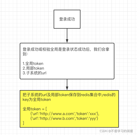 ????????????????1.登录SSO、或验证全局登录成功后,给子系统分配局部token时创建redis集合,redis的key为subsystem_url_token_list_+全局token ,值为局部子系统地址及局部token。