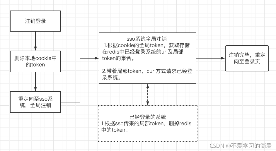 ????????????????2.点击注销登录,后端删除当前系统cookie中的token,然后重定向至sso系统退出登录的方法,方法中从cookie中获取全局token,然后从redis集合中获取所有子系统的url和local_token,循环 根据url去各自子系统接收注销的方法,子系统注销登录的方法中会根据local_token删掉子系统redis中的局部token,全部执行成功,再删掉全局redis中的token及cookie中的token。成功后 跳往登录页。(所有子系统中间件会校验cookie中的token是否与redis一致,不一致去校验全局token,全局token失效则跳往登录页,完成注销)