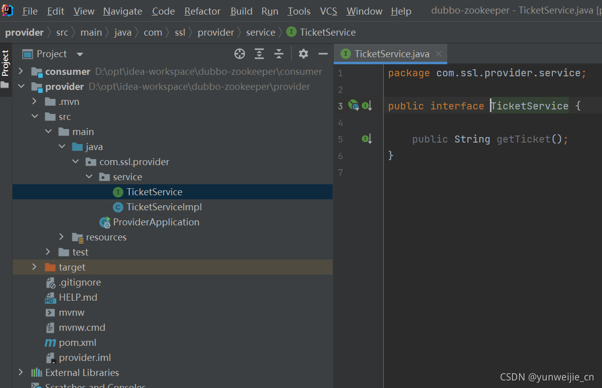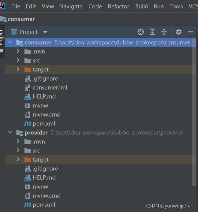 1、首先需要下载安装好dubbo和zookeeper 2、在IDEA中新建空项目,然后类同建springboot项目的方式建立两个Module,分别作为提供者和消费者,成功后如下图  3、首先进行提供者的相关配置  创建一个服务接口,表示提供的服务,然后进行实现  注意上图中@service注解用的是dubbo的而不是springboot的,或者采用@Component注解也可 然后配置applicatin.properties  server.port作为该模块运行的端口 …name作为提供者的名称 …address作为注册中心的地址 …base-package用来扫描提供的对应的服务 …metadaa-report(解决控制台出现元数据无法显示的问题) 4、进行启动 首先启动zookeeper,然后启动dubbo,最后运行ProviderApplication.java,出现如下结果(注意图中8080端口,跟自己配置相关):