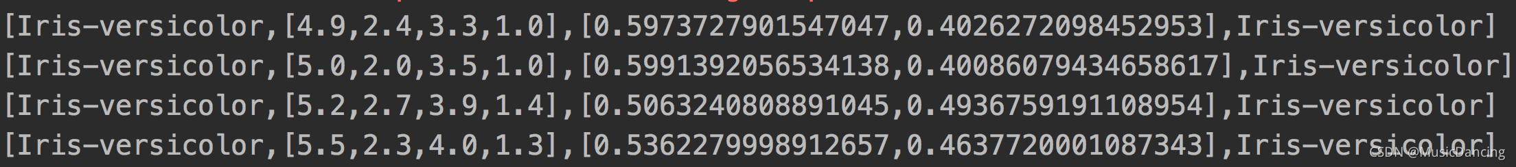 // 输出的值依次是:真实分类、特征值、预测属于不同分类地概率、预测的分类。