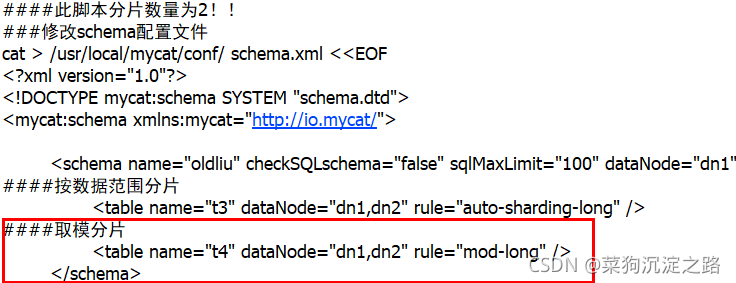 ####此脚本分片数量为2!! ###修改schema配置文件 cat > /usr/local/mycat/conf/ schema.xml <<EOF <?xml version="1.0"?> <!DOCTYPE mycat:schema SYSTEM "schema.dtd"> <mycat:schema xmlns:mycat="http://io.mycat/">