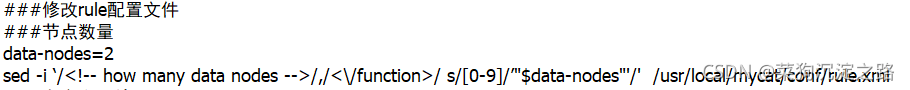 <dataHost name="localhost1" maxCon="1000" minCon="10" balance="1" writeType="0" dbType="mysql" dbDriver="native" switchType="1" > <heartbeat>select user()</heartbeat> <writeHost host="mysql7" url="192.168.100.10:3307" user="root" password="123"> <readHost host="mysql9" url="192.168.100.10:3309" user="root" password="123"/> </writeHost> <writeHost host="mysql17" url="192.168.100.15:3307" user="root" password="123"> <readHost host="mysql19" url="192.168.100.15:3309" user="root" password="123"/> </writeHost> </dataHost> <dataHost name="localhost2" maxCon="1000" minCon="10" balance="1" writeType="0" dbType="mysql" dbDriver="native" switchType="1" > <heartbeat>select user()</heartbeat> <writeHost host="mysql8" url="192.168.100.10:3308" user="root" password="123"> <readHost host="mysql10" url="192.168.100.10:3310" user="root" password="123"/> </writeHost> <writeHost host="mysql18" url="192.168.100.15:3308" user="root" password="123"> <readHost host="mysql20" url="192.168.100.15:3310" user="root" password="123"/> </writeHost> </dataHost> </mycat:schema> EOF ###修改rule配置文件 ###节点数量 data-nodes=2 sed -i '/<!-- how many data nodes -->/,/<\/function>/ s/[0-9]/$data-nodes/'