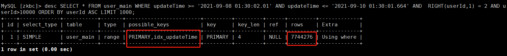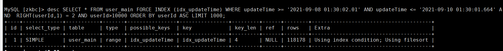 SELECT * FROM user_main FORCE INDEX (idx_updateTime) WHERE updateTime >= '2021-09-08 01:30:02.01' AND updateTime <= '2021-09-10 01:30:01.664' AND RIGHT(userId,1) = 2 AND userId>10000 ORDER BY userId ASC LIMIT 1000;