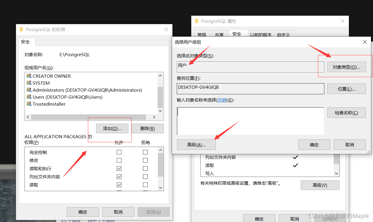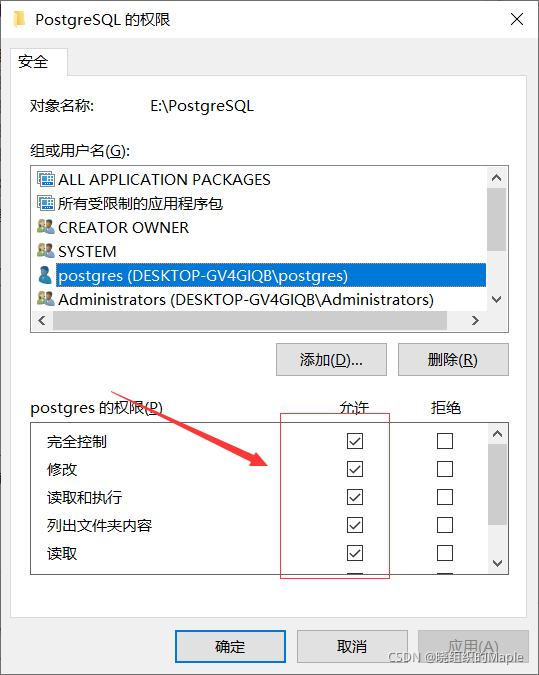 在任意盘中新建一个文件夹postgresql。右键属性-安全-编辑。