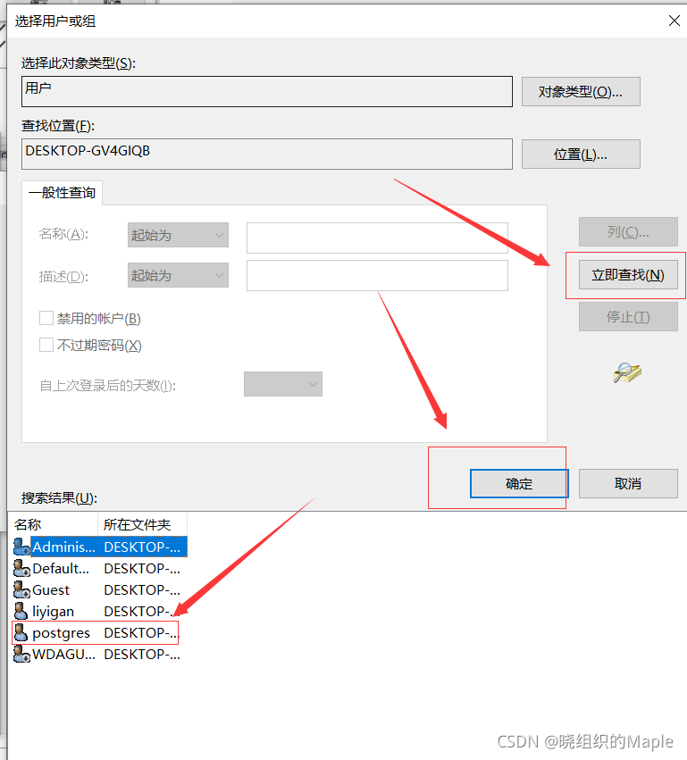 ?点击立即查找,找到postgres用户点击确定。