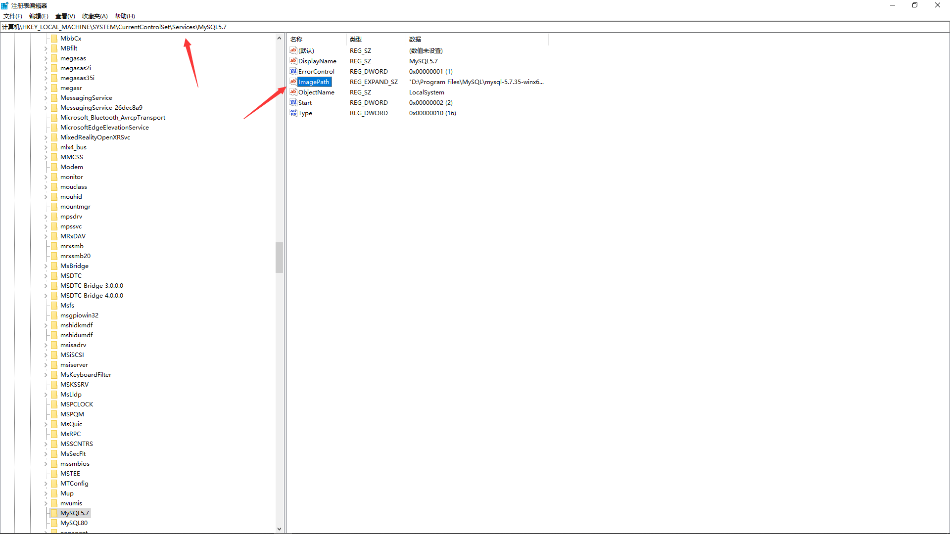 计算机\HKEY_LOCAL_MACHINE\SYSTEM\CurrentControlSet\Services\MySQL5.7