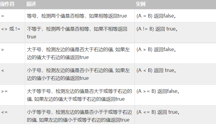 可以用在WHERE子句中的操作符列表:A=10,B=20