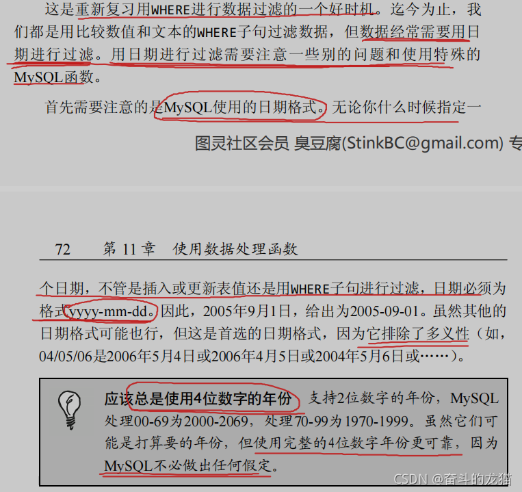 有人会说,我是用BETWEEN … AND …不就好啦。例如2001-08月下的数据,我们只要BETWEEN “2001-08-01” AND "2001-08-31"既可以检索到在2001-08的所有数据了。然而,这样写存在一些问题:我们需要明确知道当前这个月份有多少天才可以确保BETWEEN… AND… 的范围是正确的,并且如果是2月,那么我们还需判断年份是否为闰年。所以使用BETWEEN…AND…很麻烦。所以MySQL推荐我们使用Year(date)来获取date的年份,使用Month(date)来获取date的月份,通过这样的操作,我们就可以检索出给出日期这一个月份的数据了。