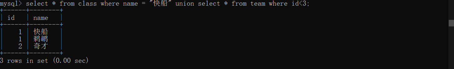 - 跨表进行数据合并时,要注意两边的查询得到的列是一致的,包括数量和类型;名字不同也没关系,沿用前面的表所查询的列名