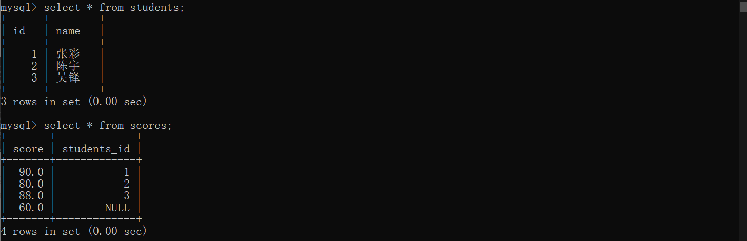 select * from student,course,score where student.id = score.student_id and course.id = score.course_id;