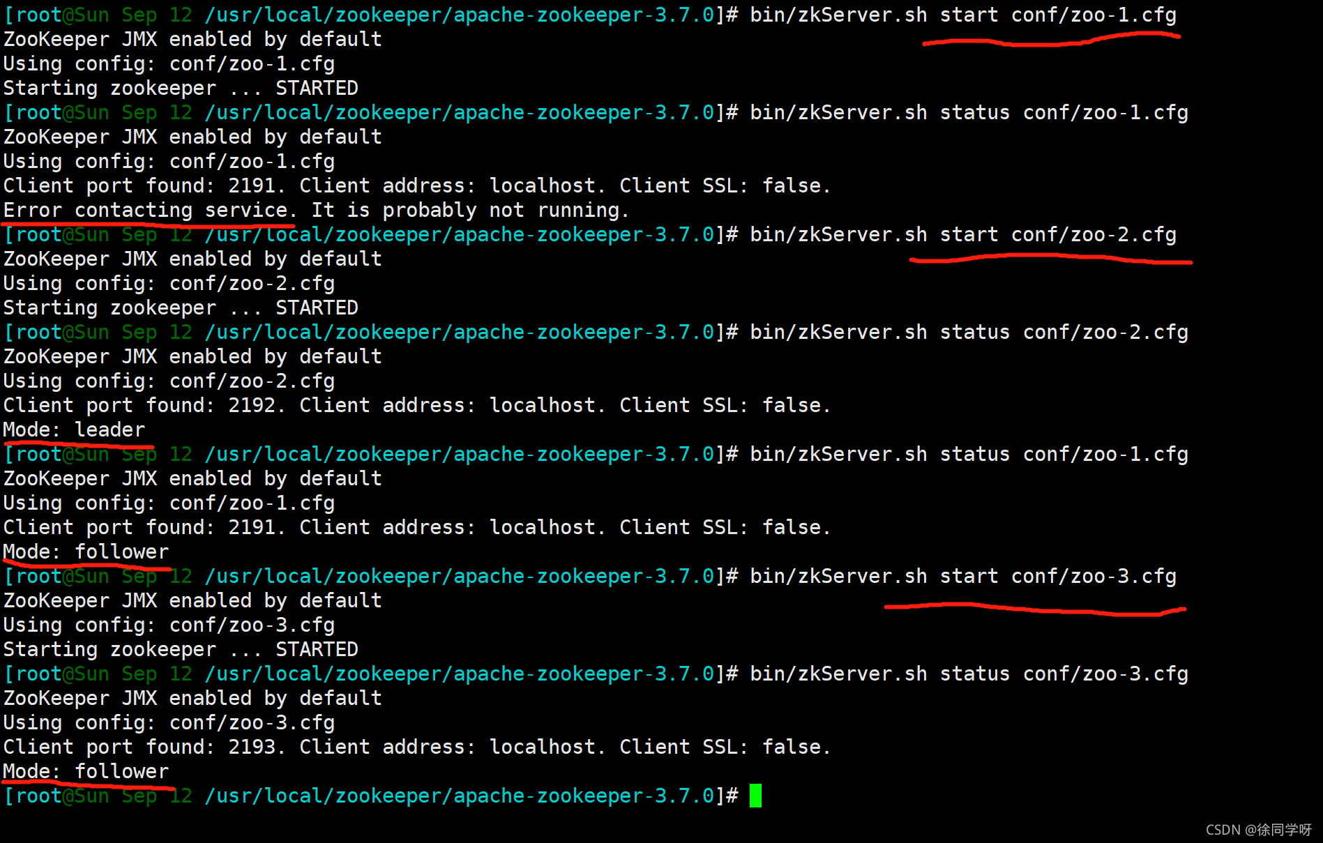 注:如果原先集群运行了一段时间,产生了数据不一致,然后全部停机后,再一个个重启,最好是先去看看每个服务的事务日志文件内记录的最后提交的ZXID ,最大的那个服务先重启,否则可能会导致Leader 已经选举好了,后面一个带着最全数据的服务节点重启了,反而要回滚事务。