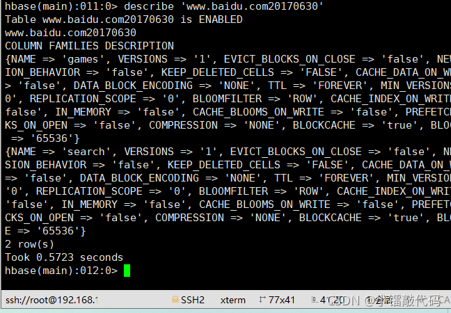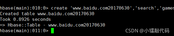 1、创建表 create '表名', '列族名1','列族名2'......'列族名N'