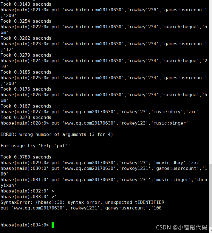 put 'www.baidu.com20170630','rowkey123','search:bagua','huang xiao ming'