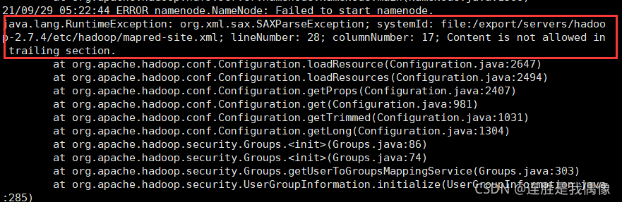 报错分析:1. 找到ERROR在第一行中有个“ ERROR ” ,那我们就从这里开始看,这里后面会告诉你错在哪个文件夹哪行哪里,具体错误是什么 2. SystemId这里告诉了你在文件(file)中,/export/servers/hadoop-2.7.4/etc/hadoop/mapred-site.xml这个文件出错了。那我们就要切换到文件的目录下,启用vi编辑器查看具体信息。 cd /export/servers/hadoop-2.7.4/etc/hadoop/