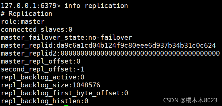 准备环境搭建完成,接下来需要进行主从配置,并开启哨兵模式。 默认情况下,开启的三个redis都是主节点,用命令info replication查看,如下所示。